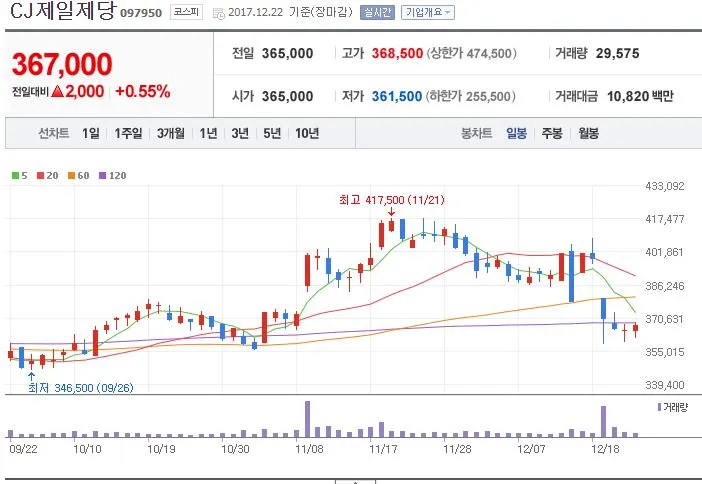CJ제일제당의 결정에 시장은 우려의 반응입니다. 실제로 공시가 나왔던 12월 19일 CJ제일제당의 주가는 5% 이상 급락하였고, 이틀이 지난 오늘까지도 하락세를 이어가고 있습니다.