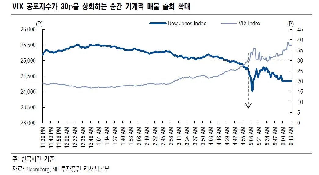정확히 VIX가 30을 넘어가는 시점부터 다우지수가 폭락하기 시작합니다. 이는 펀드멘탈이나, 돌발 악재 출현이 아닌, 최근 금리 상승, 밸류에이션 부담, 인플레이션 우려, 정치적 불확실성 등이 복합적으로 작용하면서 VIX가 급등한 결과로 이해할 수 있습니다.