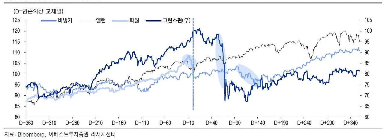 D-DAY 전후 90일 선에서 폭락이 있었던 것을 알 수 있습니다. 우리는 이것을 연준 의장 신고식이라고 불렀고, 연준 의장의 정책의 방향 및 위기관리 능력을 평가하는 시기로 삼곤 했습니다.