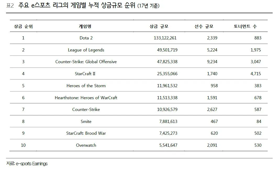 대회의 상금규모란 대회의 권위 뿐만 아니라 시장의 크기를 가늠할 수 있는 중요한 척도 입니다. 한국의 기준이라면 당연히 리그오브레전드와 오버워치가 상위 1-2위를 다툴 것으로 예상하는데요. 보시는 바와 같이 글로벌 기준은 많이 다릅니다. 1위는 도타2로, 상금규모는 LOL의 2.5배에 해당 할 정도로 차이가 많습니다.