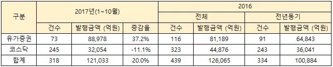 2017년 10월 말일 기준으로 상장사들이 유상증자로 조달한 자금 규모가 작년 동기 대비하여 20% 늘었다고 한다.