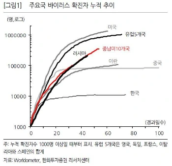 아직 중남미와 러시아는 현재까지도 꾸준히 확진자가 증가하고, 증가폭이 완만하지 않습니다.