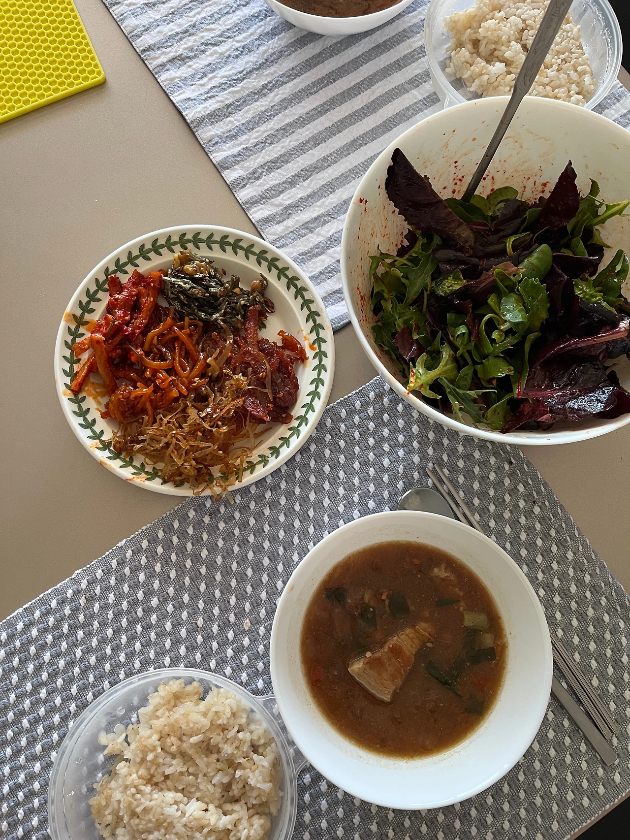 거실 식탁 한가운데 진짜 된찌 한 상이 떡 하니 차려져 있다. 마드리드의 햇살이 스며 들어오는 거실 한가운데 모락모락 피어오르는 된찌라니. 이건 뭐 어느 호텔 스위트룸에 그 어떤 룸서비스 보다 더 완벽한 게스트 취향저격 서비스가 아닌가. 감동의 돌고래 소리를 연신 뿜어내니 친구가 입을 틀어막으며 그냥 좀 먹으란다. 부끄러워하니 오케이. 닥치고 일단 한 술 떠 본다.