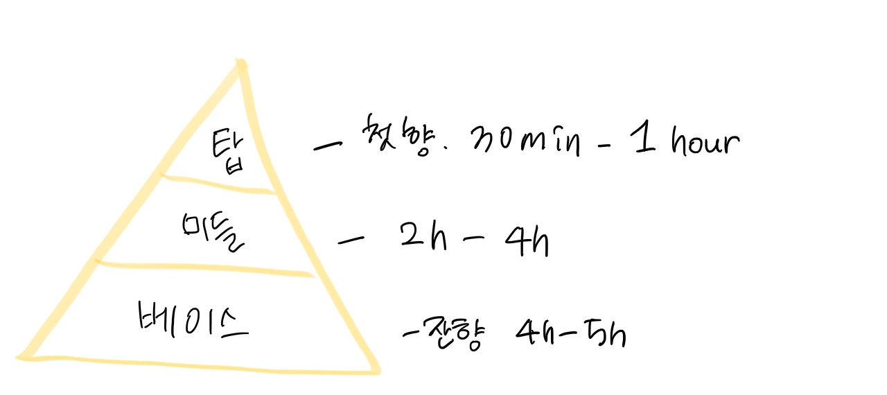 A. 향수에는 베이스 노트와 미들 노트와 탑노트가 있습니다. 탑노트는 고객님께서 매장에서 시향 하실 때, 즉 뿌리자마자 나는 가장 첫 향이 탑노트입니다. 향수는 시간에 따라 향이 변화하는데 피라미드 모양으로 향을 쌓아서 만들었다고 생각하시면 좋습니다.