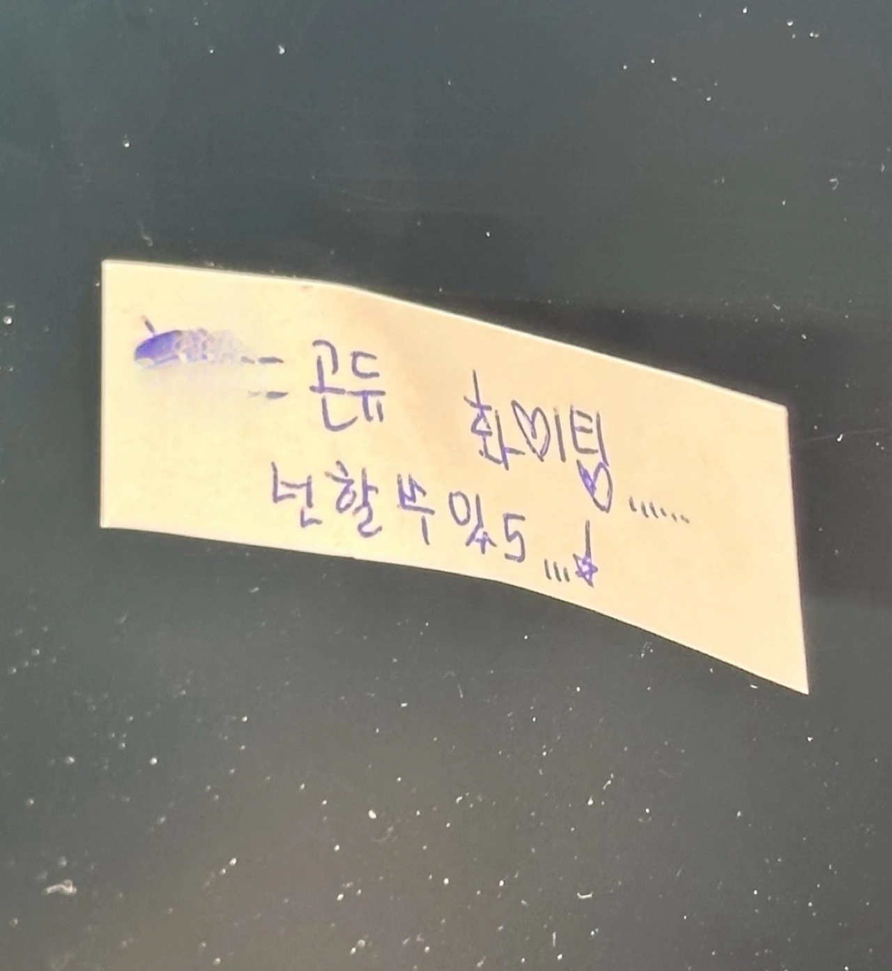 1. 일이 유독 많은 백화점 말일 날 아침. 월마감을 혼자 처리해야 해서 걱정이 많은 채로 출근했는데, 전날 퇴근한 시니어언니가 노트북 모니터에 붙여두고 간 쪽지. 2. 치킨집 사장님의 서비스 귤과 함께 온 따뜻한 메세지. 텍스트에서 온도가 느껴진다.
