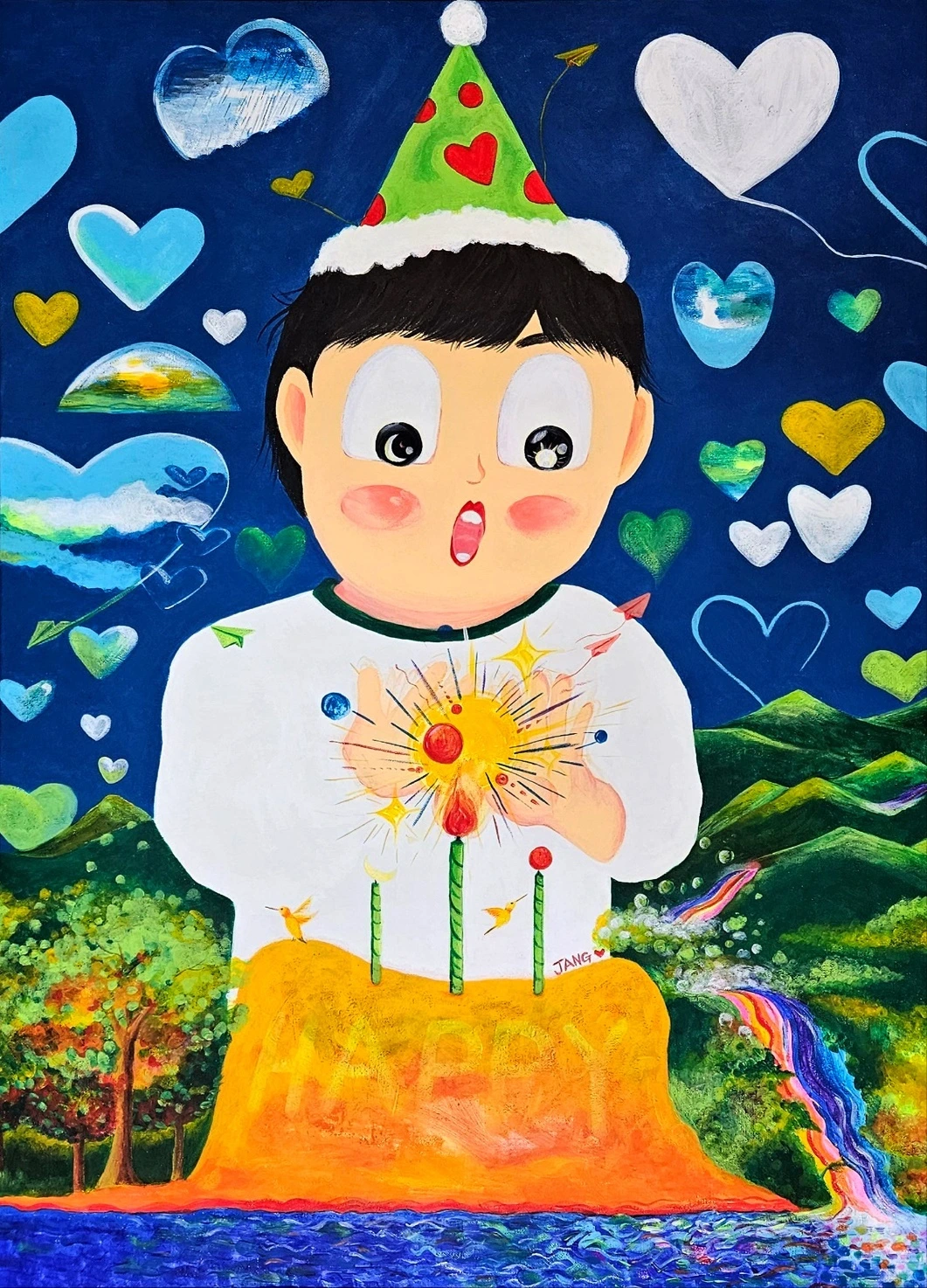 태어난 날은 이토록 행복하고 희망찬 날이길 바라는 마음으로 색채와 표정을 지어봤다.