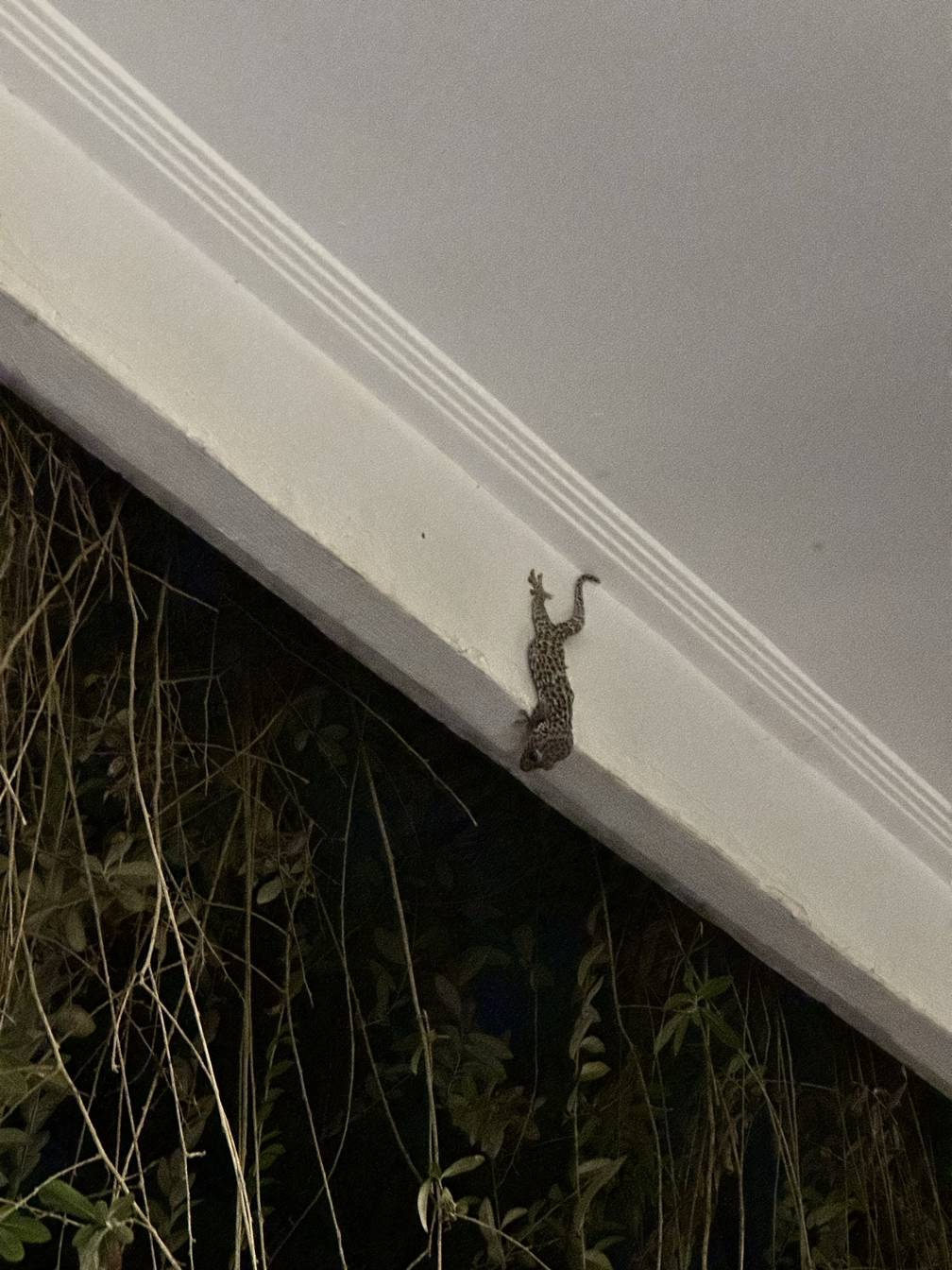 문 앞에 나방이 한 마리 날아다니고 있었는데 맞은편 벽에는 찌짝(도마뱀)이 붙어 있는 것이 아닌가