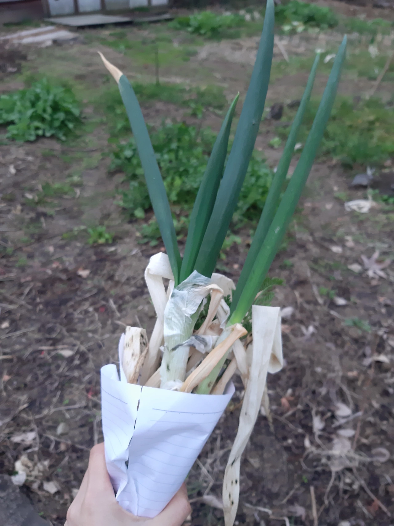 필라가 커다란 당근을 뽑아 주셨다. 아직 텃밭에는 쓰이지 않고 남아있는 파, 고수, 봄동이 있어 칼과 장갑을 내어주시며 수확해서 가져가도 된다고 하셨다. 집에 사두었던 쌀국수 소스와 쌀국수면이 생각나서 고수를 수확하고 요즘 고기보다 비싸다는 금파를 수확했다. 파 1개는 화분에 심어 키어볼까 생각해 2개를 뽑았다. 뽑고 나니 '흙이 뭍은 걸 어떻게 가져가지' 난감했지만 공책에서 종이 한 장을 찢어 뿌리 부분을 감싸고 이름표 스티커를 붙여 고정시키고 나니 제법 꽃다발 같은 모양새가 나왔다. 한 손에는 우산을 들고 한 손에는 작물을 들고 물 웅덩이를 살피면서 가는데, 묶지 않은 우산의 빈 공간들이 보였다. 딱 꽃다발을 꽃기에 적당해 보이는 우산 속 공간.
