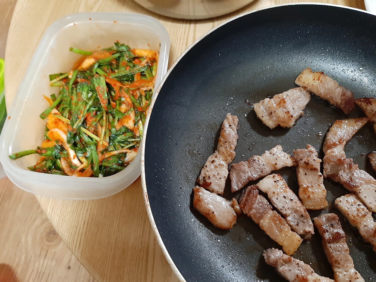 하루에 한 번 요리를 하겠다고 마음먹은 후 요리를 하고 먹어서 없애는 것도 중요한 일이 되었다. 한번 먹으면 끝나는 게 아니라 반찬 같은 경우에는 냉장고에 쌓인다. 쓰고 남은 식재료도 쌓인다. 또 새로운 식재료를 사서 요리를 하면 냉장고가 가득 찰 테니 얼른얼른 먹어서 치워야 한다. 전에 만든 부추 겉절이, 쓰지 않은 레몬, 딸기잼이 아직 냉장고에 있다. 부추 겉절이는 그냥 반찬으로 먹기엔 손이 잘 안 간다. 나 혼자서 한 번에 다 먹고 끝낼 수 도 없어서, 그래서 삼겹살을 샀다. 배보다 배꼽이 더 크다고... 고기를 굽고 그 위에 겉절이를 올려서 젓가락으로 집어 한입 가득 먹었다.