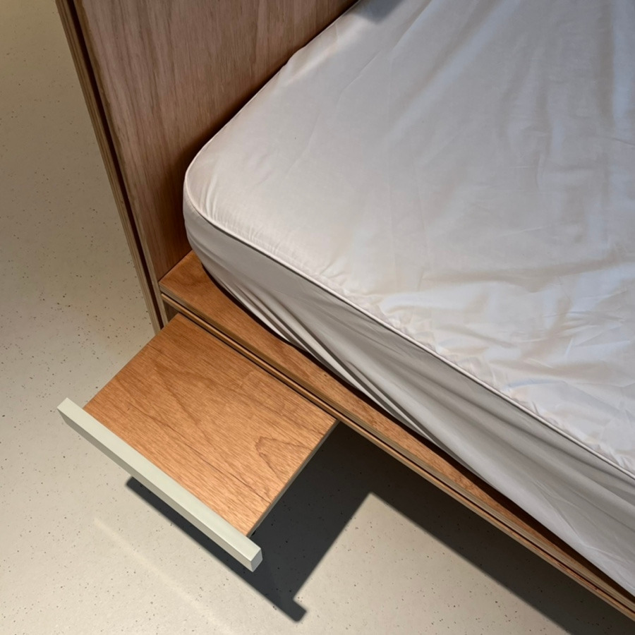 침대 헤드 근처에는 선반으로 활용할 수 있는 부분이 있었어요. 넣었다 뺐다 할 수 있고, 바로 밑에는 콘센트가 붙어 있어 충전하면서 핸드폰을 놓기 딱인 공간!