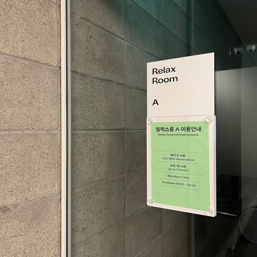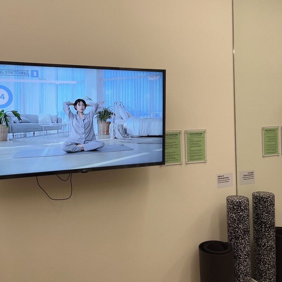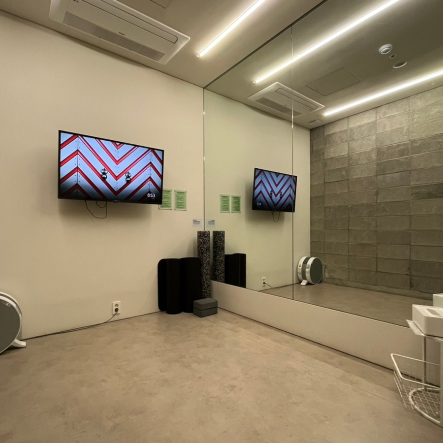 운동할 수 있는 공간으로는 플렉스룸과 릴렉스룸, 두 가지가 있었어요. 플렉스룸에서는 기구를 사용할 수 있고, 릴렉스룸은 영상 미러링이 가능해서 홈트를 사랑하는 에디터에게 딱이었답니다 ღ’ᴗ’ღ 한쪽 벽 전체가 거울로 되어 있어서 동작을 확인하기에도 좋은 구조였어요.