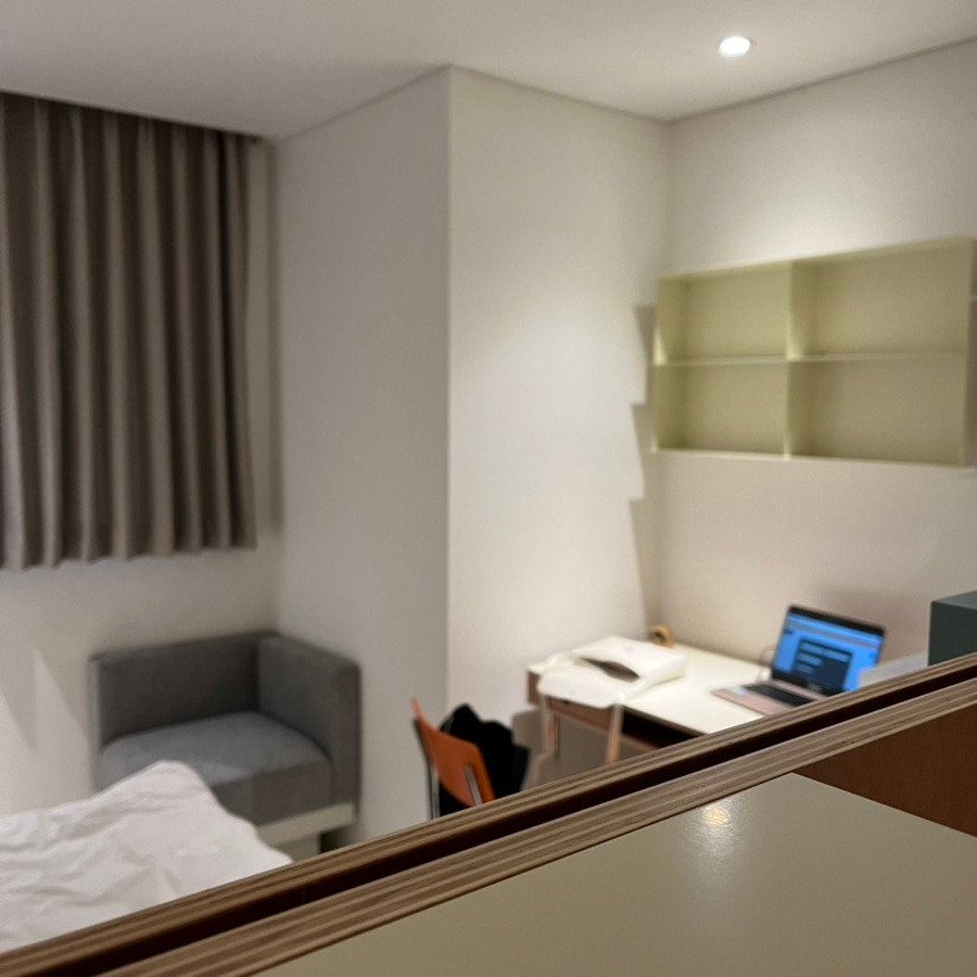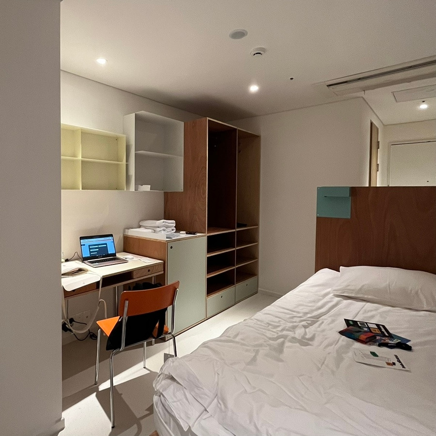 간단히 공간 투어를 마친 후, 배정된 방에 들어왔어요. 마침 와디즈 전시에서 봤던 것과 같은 구조의 1인실이었고, 그렇게 넓은 면적은 아니었지만 방에 들어서자마자 보이는 침대 헤드가 높은 편이라 어느 정도 공간 분리 효과가 있었어요. 간단한 수납도 가능하고, 벽에는 거울이 달려 있어서 나름 활용도 높은 공간이었답니다 ღ