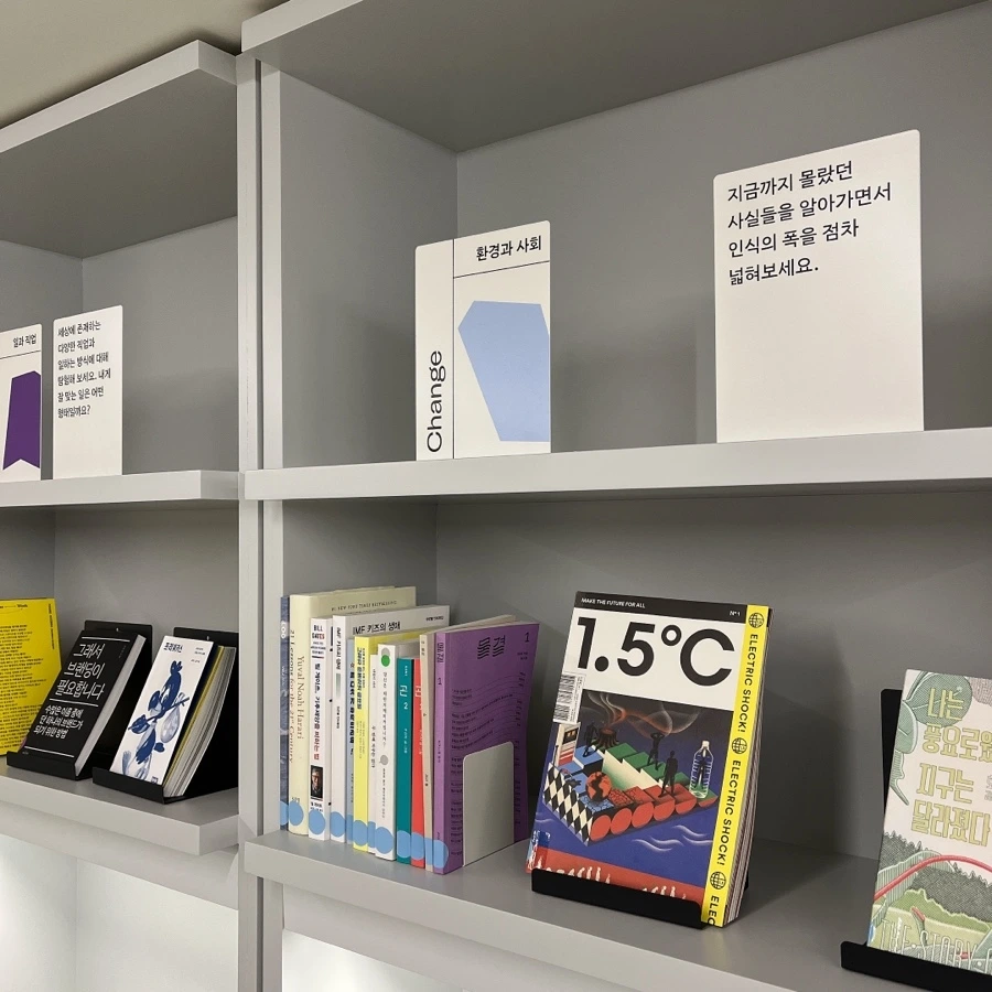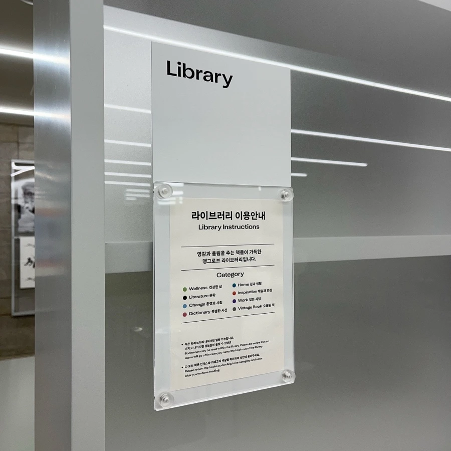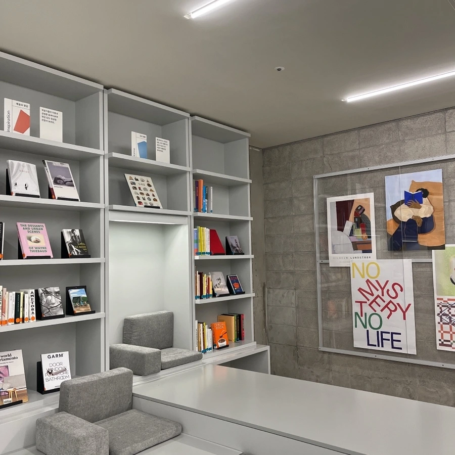 또, 라이브러리는 벽을 따라 책이 가득한 공간이었어요. 비록 책을 밖으로 빌려갈 수는 없지만, 중간중간 두껍고 푹신한 소파 모양의 쿠션 덕분에 내부에서도 충분히 편안하게 읽을 수 있었습니다. 특히 주기적으로 큐레이션 중인 공간이라고 하니, 에디터 선정 다시 방문하게 된다면 제일 열심히 이용하고 싶은 곳 1위 ✨