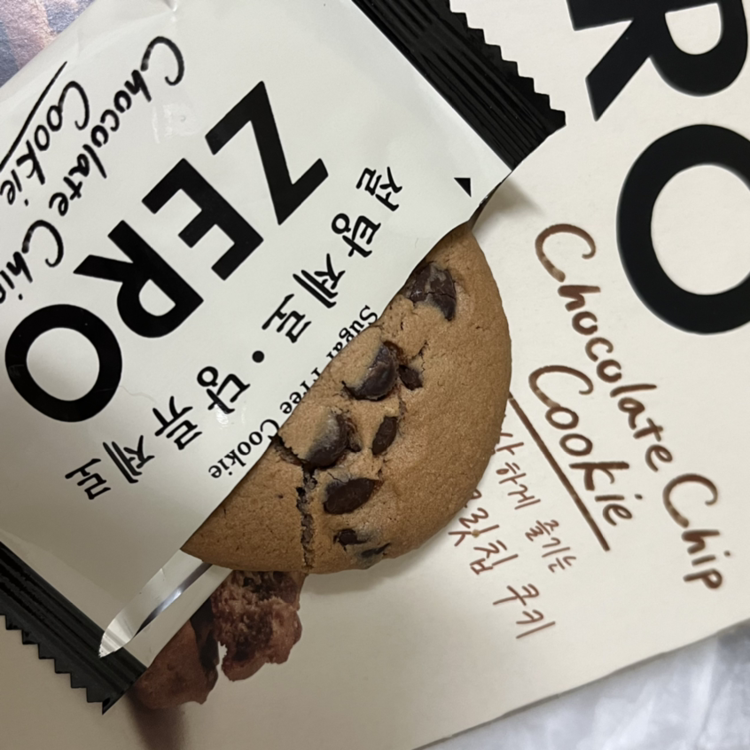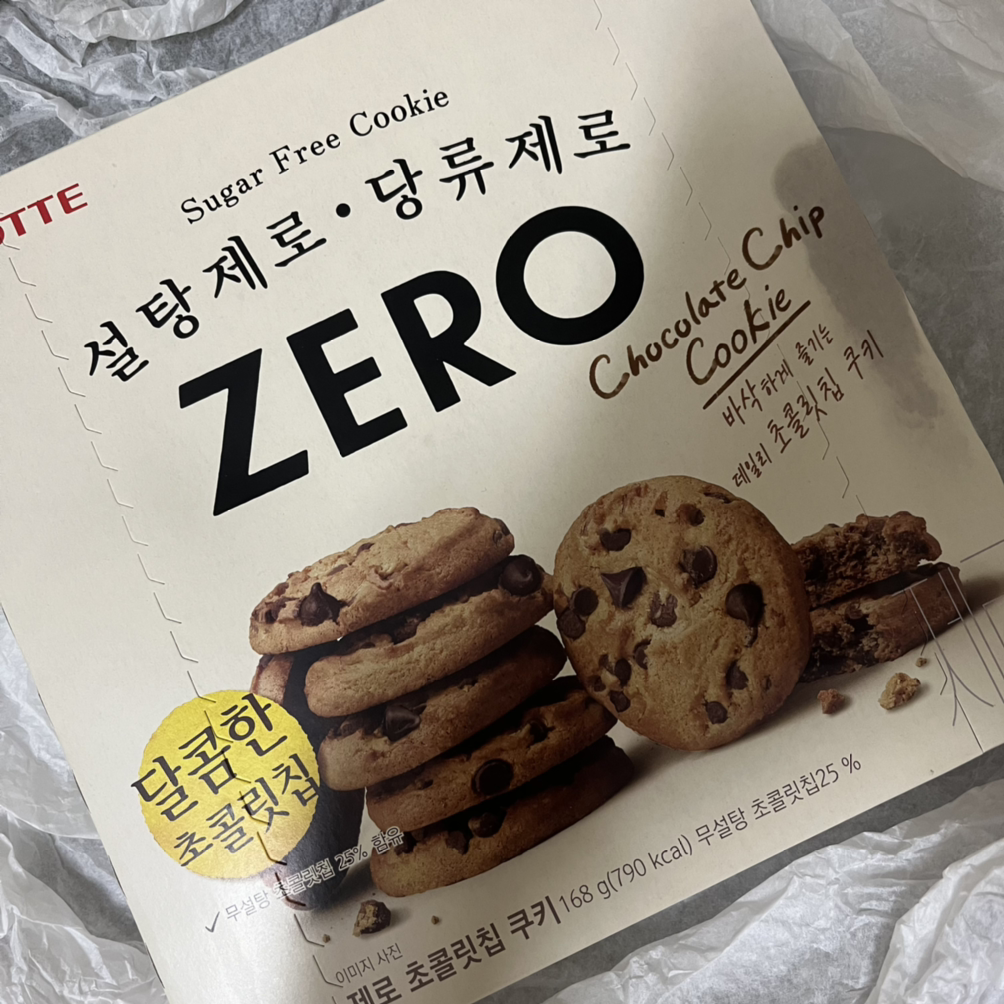 바로, 제로 초콜릿칩 쿠키! 아무래도 과자에는 들어가는 재료가 많다 보니 음료처럼 칼로리를 아주 낮출 수는 없겠지만, 초콜릿임에도 당류 함량이 낮다는 점이 마음에 들었어요.