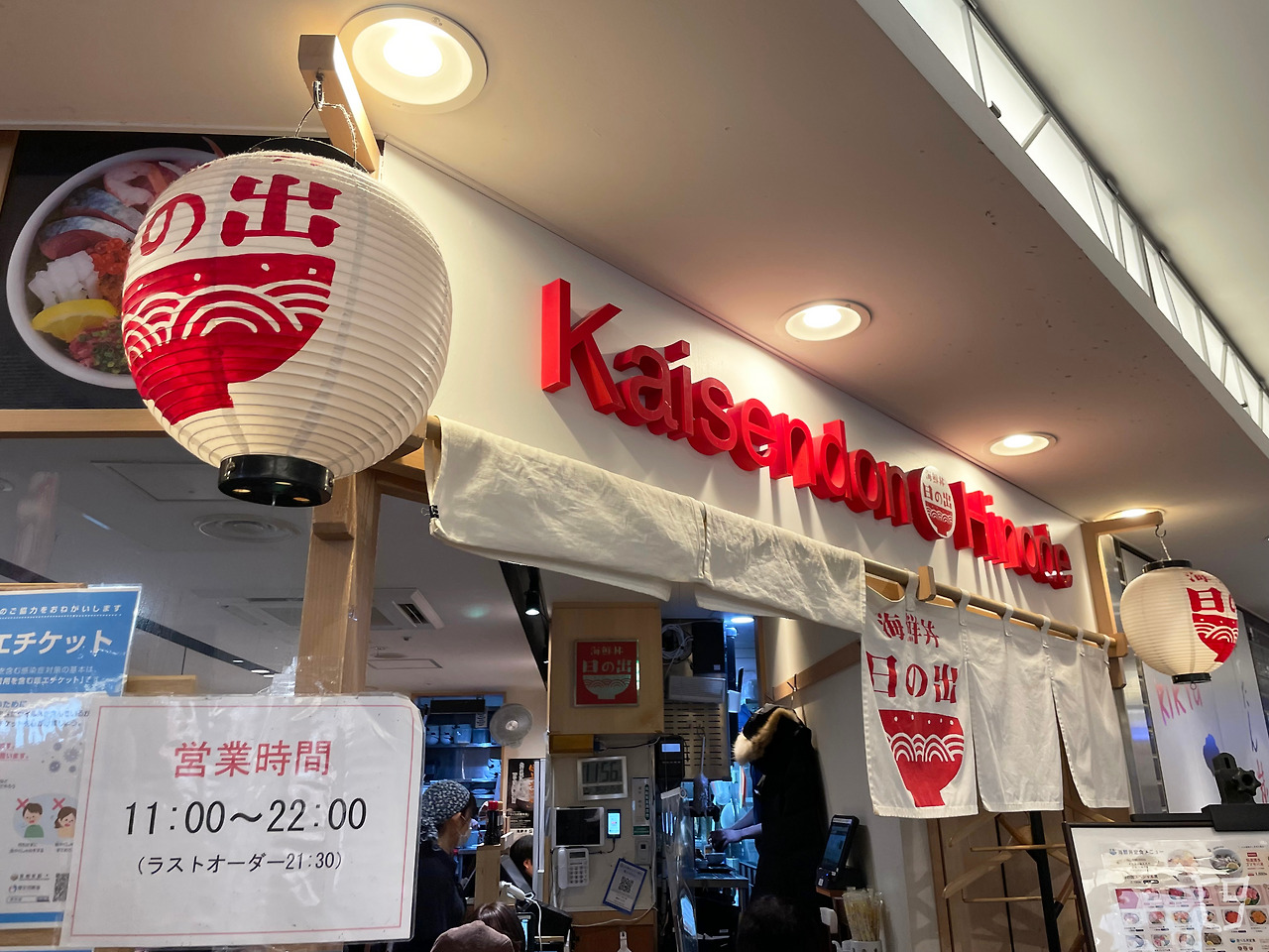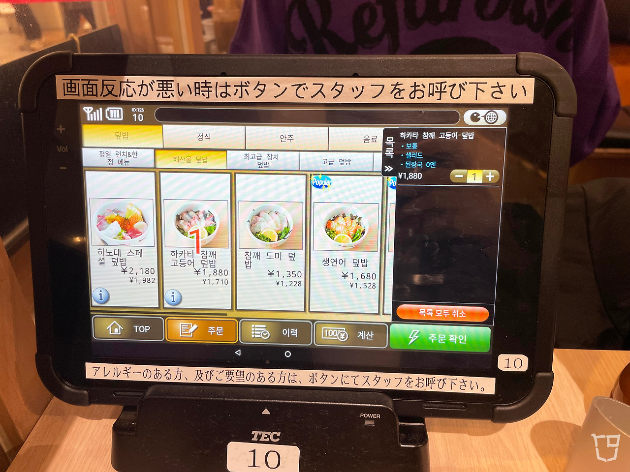 카이센동 히노데는 바로 이 참깨 고등어 회를 밥 위에 얹은 '고마사바동'을 즐길 수 있는 곳이다. 후쿠오카 야쿠인오도리 역 근처에 본점이 있다. 이날 방문한 곳은 하카타 역에 위치한 분점. 점심시간대에 맞춰 방문하니 대기 줄이 길게 늘어서 있었으나, 회전율이 빠른 편이었다. 주문은 테이블에 붙어 있는 태블릿을 이용한다. 한국어로 설정을 변경할 수 있어 그다지 어렵지 않다.
