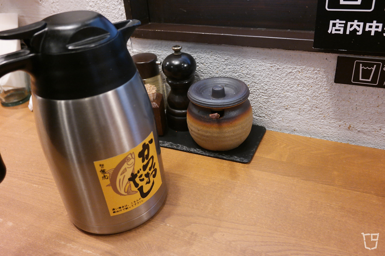 인기 메뉴는 '농후 츠케멘'과 '카라카라(매운) 츠케멘'. 키오스크로 주문을 마치고 자리에 앉으면, 모든 좌석에 놓여 있는 커다란 스테인리스 물통이 눈에 들어온다. '물인가?' 하고 무심코 집으려다 물통에 붙어 있는 라벨을 보고 손을 거뒀다. 이 통에 들어 있는 건, 다시 국물이다. 츠케멘 국물의 맛이 너무 진하거나, 간이 너무 강할 경우에 넣어 먹는 용도다. 양념 통에는 고춧가루, 다진 마늘 등이 있다. 가게 분위기는 매우 활기찬 편. 최신 유행곡이 흐르는 가운데, 점원들이 가게를 드나드는 손님에게 목청껏 인사를 건넨다.