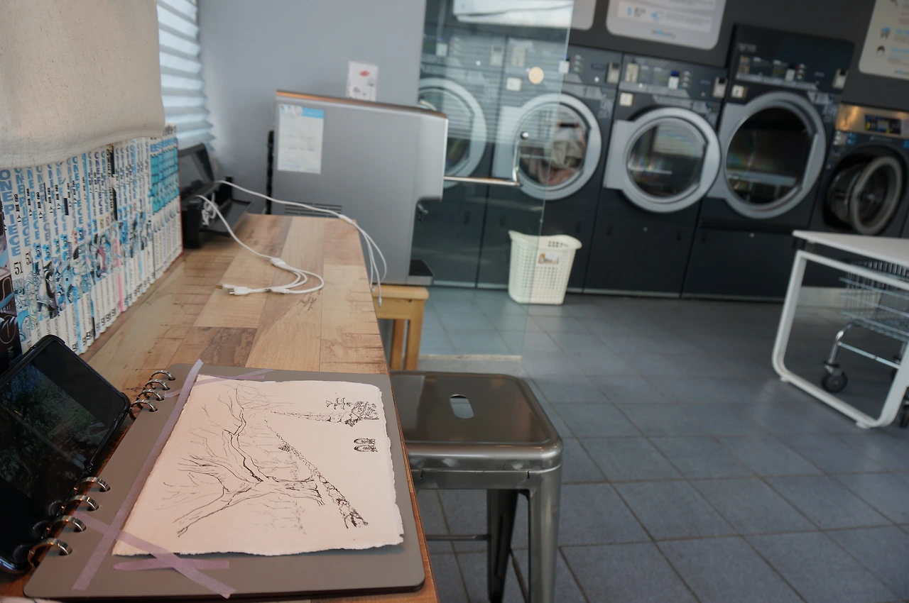 빨래하는 동안 그림을 그리면 좋을 것 같아서 챙겨 온 종이와 펜을 꺼낸다. 숲에 갔을 때 그림으로 그려두고 싶은 풍경이 있었지만 상황이 되지 않아 휴대폰으로 찍어둔 사진도 찾는다. 오랜만에 펜을 드니 어디서부터 시작해야 할지 고민이다. '일단 시작하면 된다.'던 말이 떠올라 가장 의미를 두고 찍은 나무는 제쳐 두고, 사진 속 끝에 찍힌 내 운동화를 먼저 그린다. 내가 그 속에 있었음을 알 수 있는 유일한 흔적이니. 운동화부터 그리기 시작한 그림이 의연한 나무를 그리고, 길을 표현할 때쯤 빨래가 다 되었다는 것을 알아차린다. 이 세탁기는 세탁이 완료되어도 집에서처럼 소리로 알려주지 않는다.