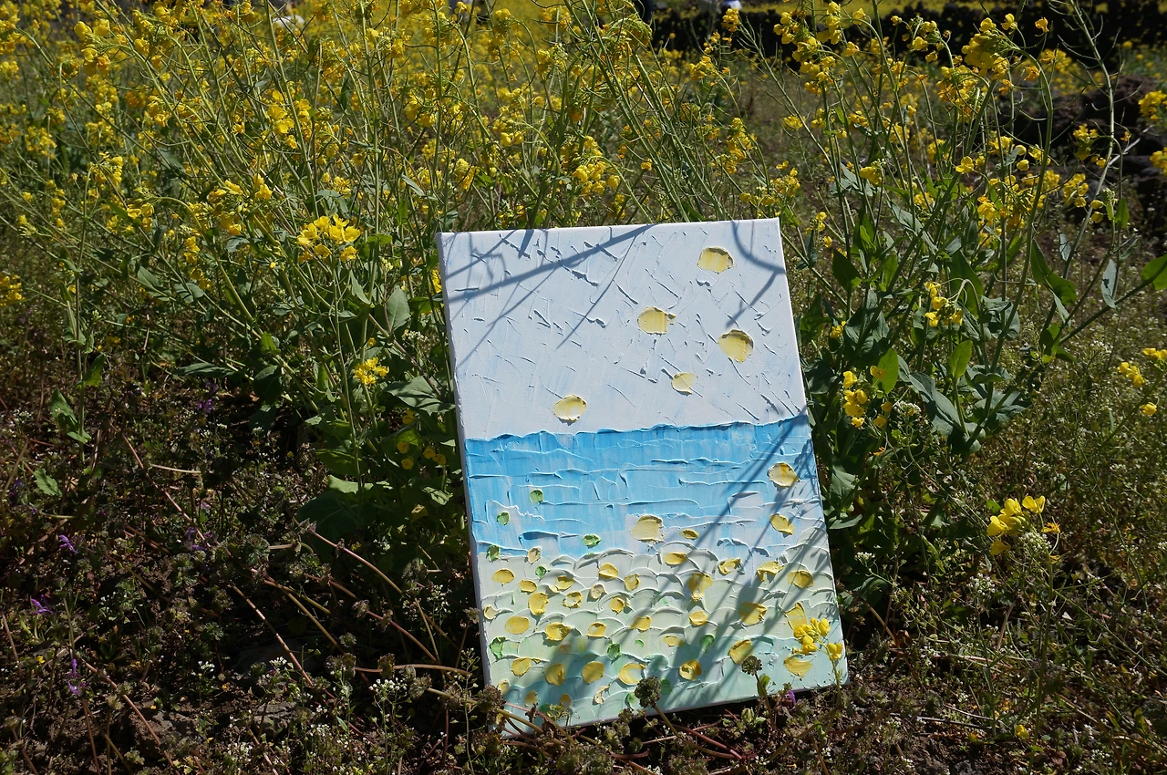 이번엔 '백드롭페인팅'에 도전한다. 두 번째 방문이라 그런지 따뜻한 음료를 서비스로 준다. 실내에서 따뜻한 차를 마시며 창 밖을 보니, 가차없이 흔들리는 나무도 거칠게 부서져 흩어지는 파도도 자연의 평온함일 뿐이다. 여유 있게 차를 마시면서 '어떻게 그릴까' 구상을 하고 하늘, 바다, 유채꽃의 느낌을 담아 캔버스를 채워간다. '나이프'라는 걸 처음 사용해서 그런지 낯설지만 묘한 재미가 있다. 배경의 느낌으로 쓱쓱 채워가다 보니 그림을 그리는 속도가 빠르다. 전체적 화폭은 채워졌고 마지막 유채꽃만 표현하면 된다. 생각처럼 표현이 되지 않아 몇 번의 시행착오가 있었지만 백드롭페인팅이 완성되었다. 지난주 3시간이 걸려 완성된 작품에 비하면 1시간 밖에 걸리지 않은 작품이지만 썩 마음에 든다.