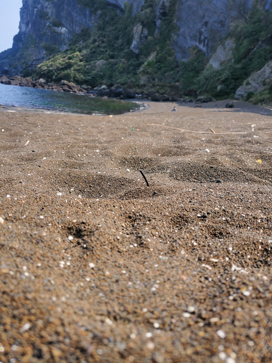 해녀의 집으로 내려가는 해안절벽 아래에 검은 흙으로 된 넓은 해변이 보인다. 정상에 대한 실망이 있었던 터라 고민이 되긴 하지만 일단 내려간다. 모래를 피해 돌 위로 걷는데, 주변 사람들이 아무렇지 않게 모래 위를 걸으며 사진을 찍는다. 슬쩍 나도 모래 위를 걸어 보니 아주 신기한 흙이다. 작은 검은색 알갱이로 된 모래사장은 신발에도 손에도 전혀 묻지 않는다.
