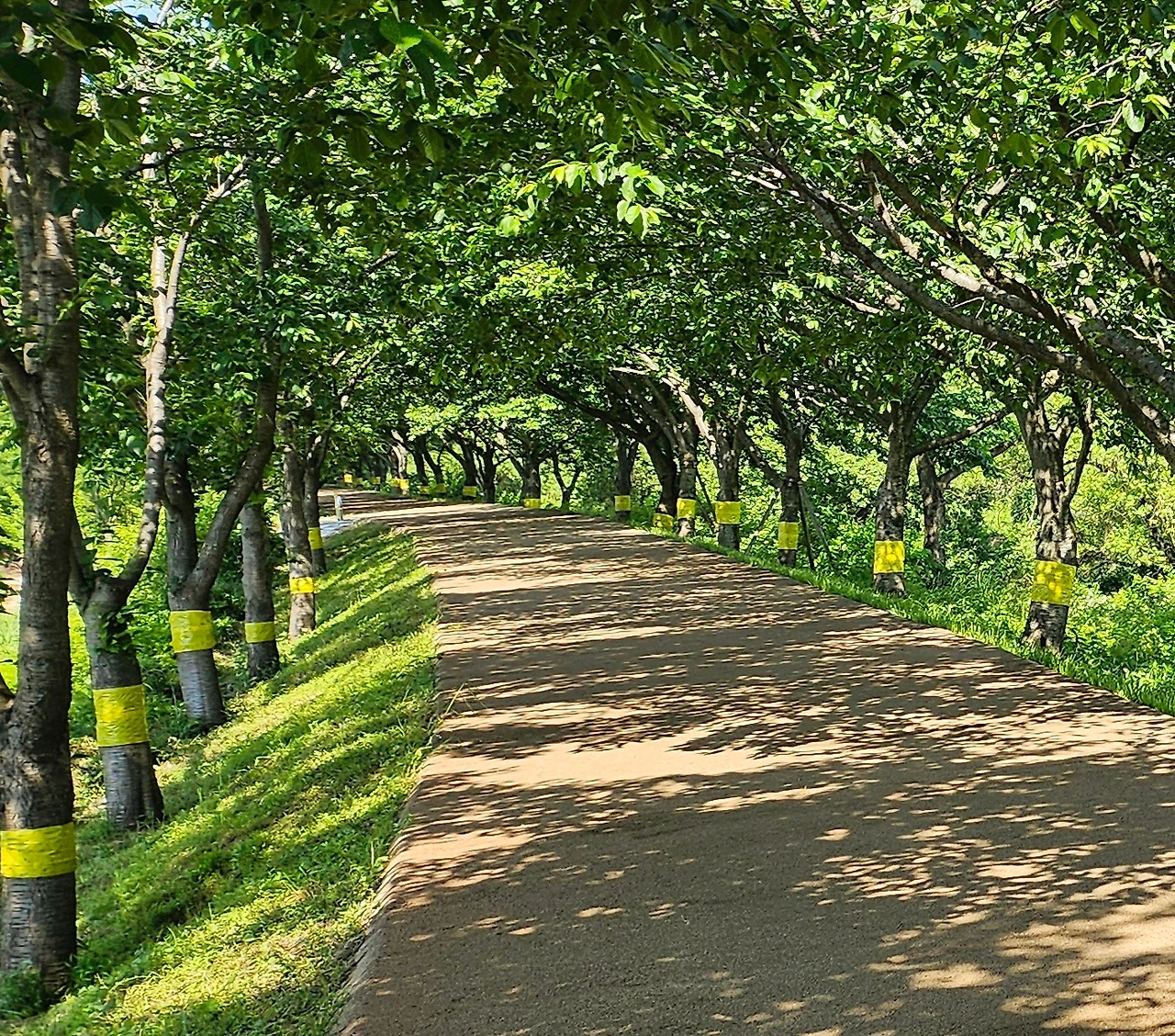 돌아오는 길 걷고 싶어 진다. 갈까 말까 하는 고민이 무색하게 운전대는 화포천을 향한다. 햇볕이 뜨겁다. 너무 준비 없이 온 탓에 햇볕을 온전히 받으며 평소 즐기던 산책로로 걸을 자신이 없다. 오늘은 가볍게 벚나무 둑길로 천천히 걸었다 되돌아오자 생각하고, 둑길 양쪽으로 쭉 뻗은 벚나무가 만들어 준 그늘길을 천천히 걷기 시작한다.