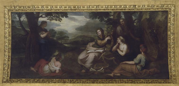 <수금(리라)을 연주하며 노래하는 사포> 그의 노래를 듣는 여성 동료들에게 둘러싸여 있는 모습이다.(Corneille Michel, the Younger, Sapho chantant et jouant de la lyre, 17th century, Versailles, châteaux de Versailles et de Trianon, ⓒ RMN-Grand Palais (Château de Versailles) / Gérard Blot)