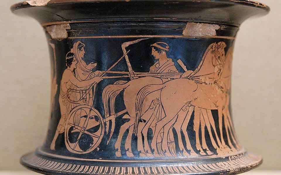 고대 희랍의 결혼 행진을 묘사한 도기 그림 (Attic red-figure pyxis, BC 440-430, public domain)