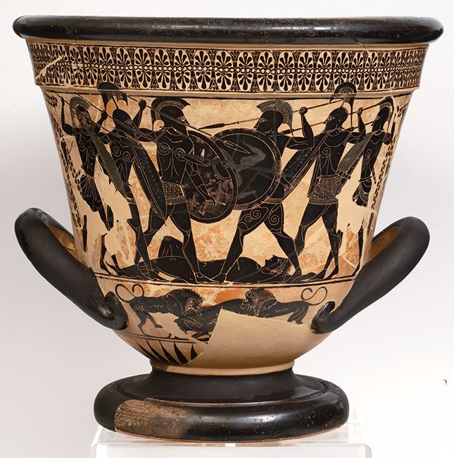 트로이아 전쟁의 한 장면(파트로클로스의 시신을 두고 싸우는 희랍군과 트로이아군)을 묘사한 도기, BC530년 경