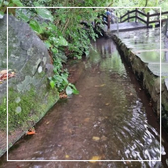 이곳 주변에는 크고 작은 저수지가 여러 개가 있다. 저수지는 논을 중심으로 보면 산 옆에 있다. 저수지에는 하늘이 파랗게 비추고, 구름이 흘러간다. 커다란 둑을 만들어 물이 채워진 저수지에는 물고기들이 살고, 사람들이 그 주변에 둘러앉아 낚시한다. 며칠 내렸던 비로 저수지의 수위가 조금 높아졌다. 저수지 옆에 나 있는 개울을 따라 평소보다 많은 물이 흐른다. 일부는 하천으로 흘러 들어가고, 일부는 양수기를 사용해서 논으로 퍼 올리고 있다.