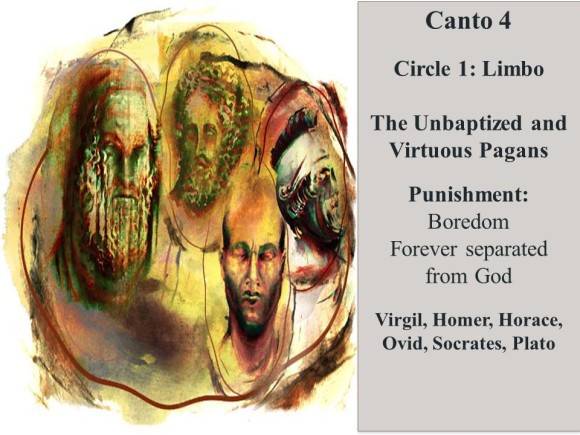 그러나, 림보에는 많은 인물들이 살고 있다. 베르길리우스도 바로 이곳에 사는 인물인데, 잠시 단테를 만나서 떠나 있는 중이다. 단테는 한 무리의 남자가 다가와 베르길리우스에게 인사하는 것을 보았다. 베르길리우스가 동료 시인들을 소개한다. 호메로스, 호레이스, 오비디우스, 루칸(Lucan) 모두 동급의 위대한 시인들이다.