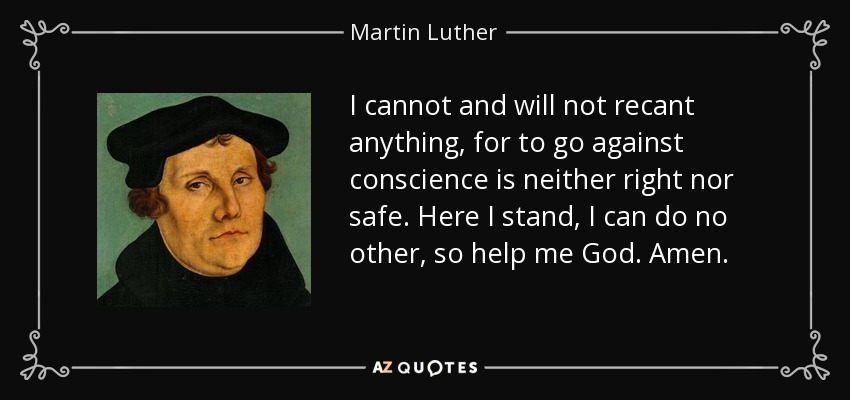"나는 내 양심과 내가 인용한 성경에 포로가 되었습니다. 나는 내 주장을 철회할 수도 없고, 하고 싶지도 않습니다. 내 양심과 성경을 거스르는 것은 옳지도 않고 안전하지도 않습니다." 마르틴 루터