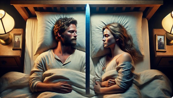 고대 노르웨이 서사시에서 따온 글귀인데, 남자와 여자가 파란 강철 칼날을 사이에 두고 나란히 누워있는 마지막 밤을 보내는 장면을 묘사한다. 시력을 읽어가는 남자가 1인칭으로 표현하는 이 묘사는 보르헤스가 늦은 나에게 겪은 실명을 의미하고 세상에는 '친밀한 단절'로 가득하다는 의미이다.