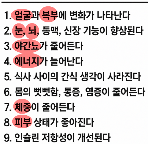 2주간 설탕단식을 하면, 얼굴 부기가 빠지고 뱃살이 줄어든다. 혈당과 염증 수치가 낮아져, 눈의 피로감이 줄어든다. 야간뇨가 줄어든다.
