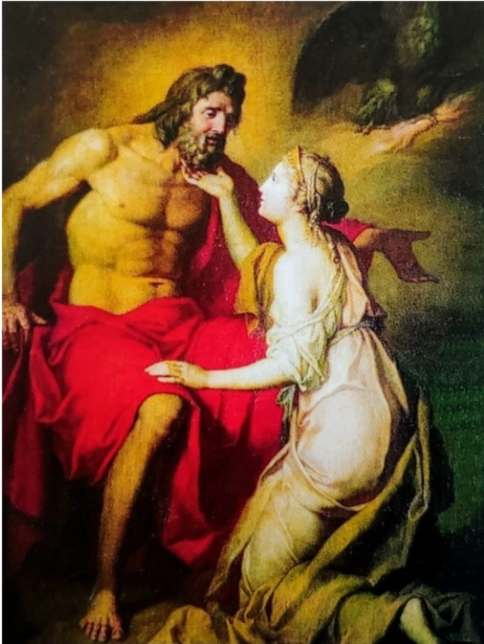 테티스는 아들 아킬레우스의 명예를 회복시켜주려고 하늘을 넘어서 올림푸스 산으로 가서 제우스 신을 만나서 탄원을 한다. 탄원하는 자세는 왼손으로는 제우스의 허벅지에 놓고 오른손으로는 제우스의 턱을 만지며 '제우스의 명예를 회복시키기 위해서 트로이 군에게 승리를 내려달라'고 탄원한다. 아킬레우스는 그리스 장군인데 왜 적인 트로이 군의 승리를 기원할까? 그리스 총사령관 아가멤논이 패배하고, 그리 인해서 사람들이 아킬레우스를 찾고 찾도록 하는 운명을 만들어달라는 요청이다. 아킬레우스의 명예를 높여주어 회복시킬 기회를 달라는 것이다.