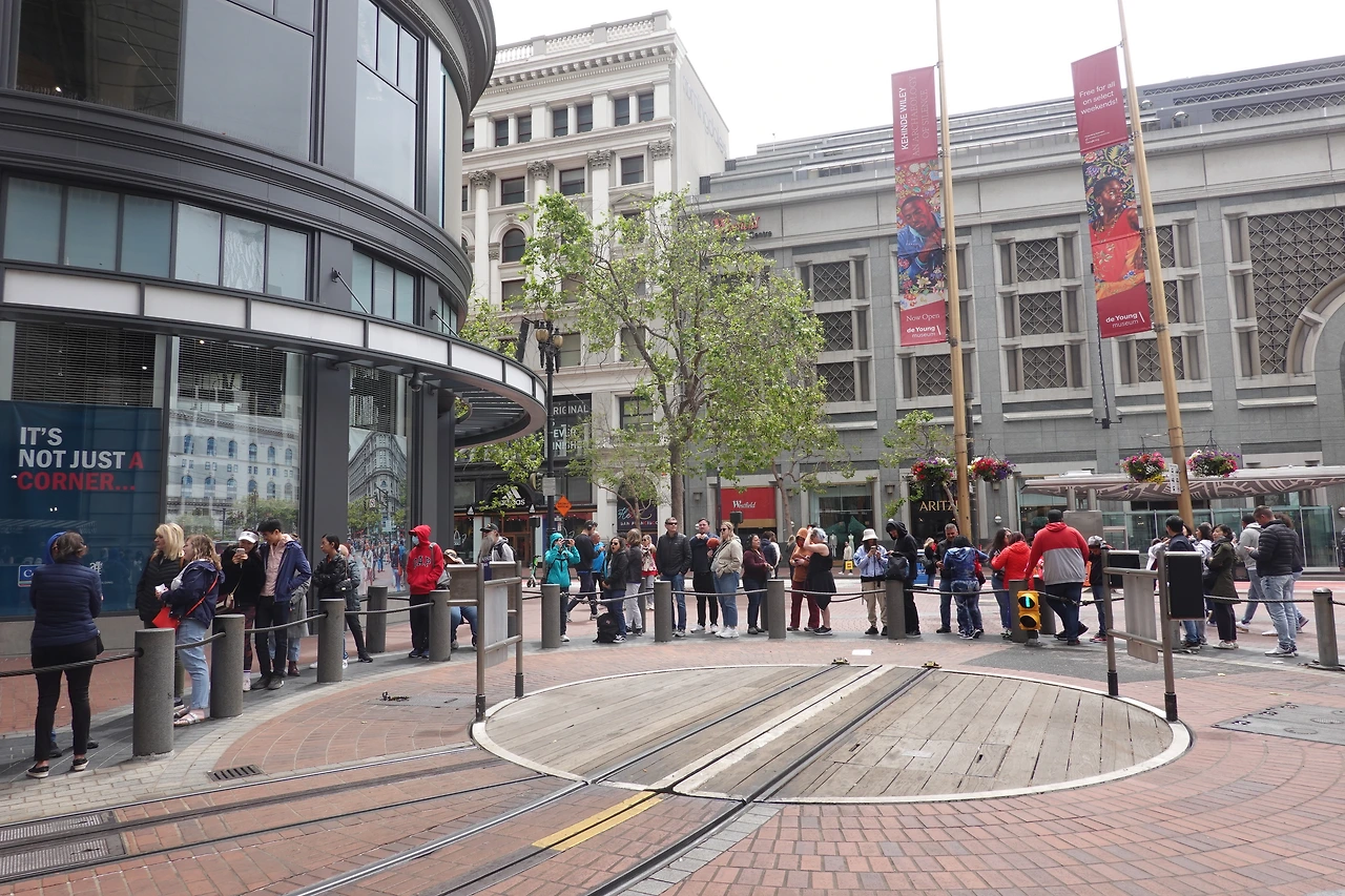 1시간 정도 기다렸다가 케이블카를 타게 됐다. 샌프란시스코의 케이블카는 노선이 크게 두 가지이다. "파웰-메이슨 라인"과 "파웰-하이드 라인"으로 나뉜다. 우리는 원래 영화 촬영지로 유명해진 롬바드 거리를 케이블카로 이동해서 먼저 가고 싶어 "파웰-하이드 라인"을 타고 싶었는데, 턴테이블 정류장에 가보니 "파웰-메이슨 라인"의 케이블카가 훨씬 많았다. "파웰-메이스 라인"의 종점역은 피셔멘스 워프였기 때문에 그곳부터 가기로 했다. 상황에 따라 일정을 바꿀 수 있는 게 자유여행의 진짜 매력이니까:)