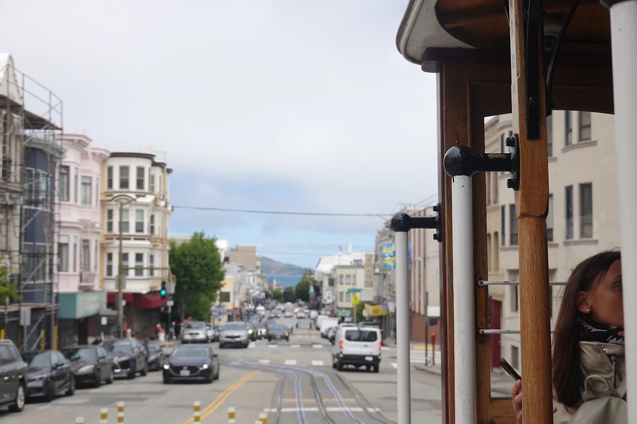 샌프란시스코의 케이블카는 경사진 도로를 위주로 지나다니기 때문에, 블록 사이마다 내리막길이었다. 그때마다 보이는 샌프란시스코 도시 전경의 모습이 너무 아름다워서 추운 바람으로 덜덜 떠는 와중에도 카메라를 놓을 수 없었다.
