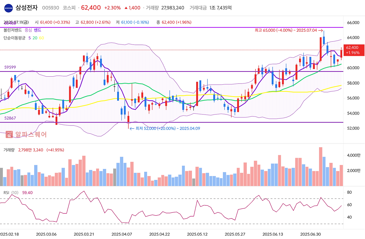 삼성전자는 최근 꾸준한 상승세를 이어가고 있어요. 7월 초 갤럭시 언팩 행사에서는 AI 생태계 전략을 본격화하면서 시장의 기대감을 끌어올렸죠. 기술적 분석으로 보면, 지금 주가는 모든 주요 이동평균선 위에 있고 RSI도 60 이상으로 강세 구간입니다.