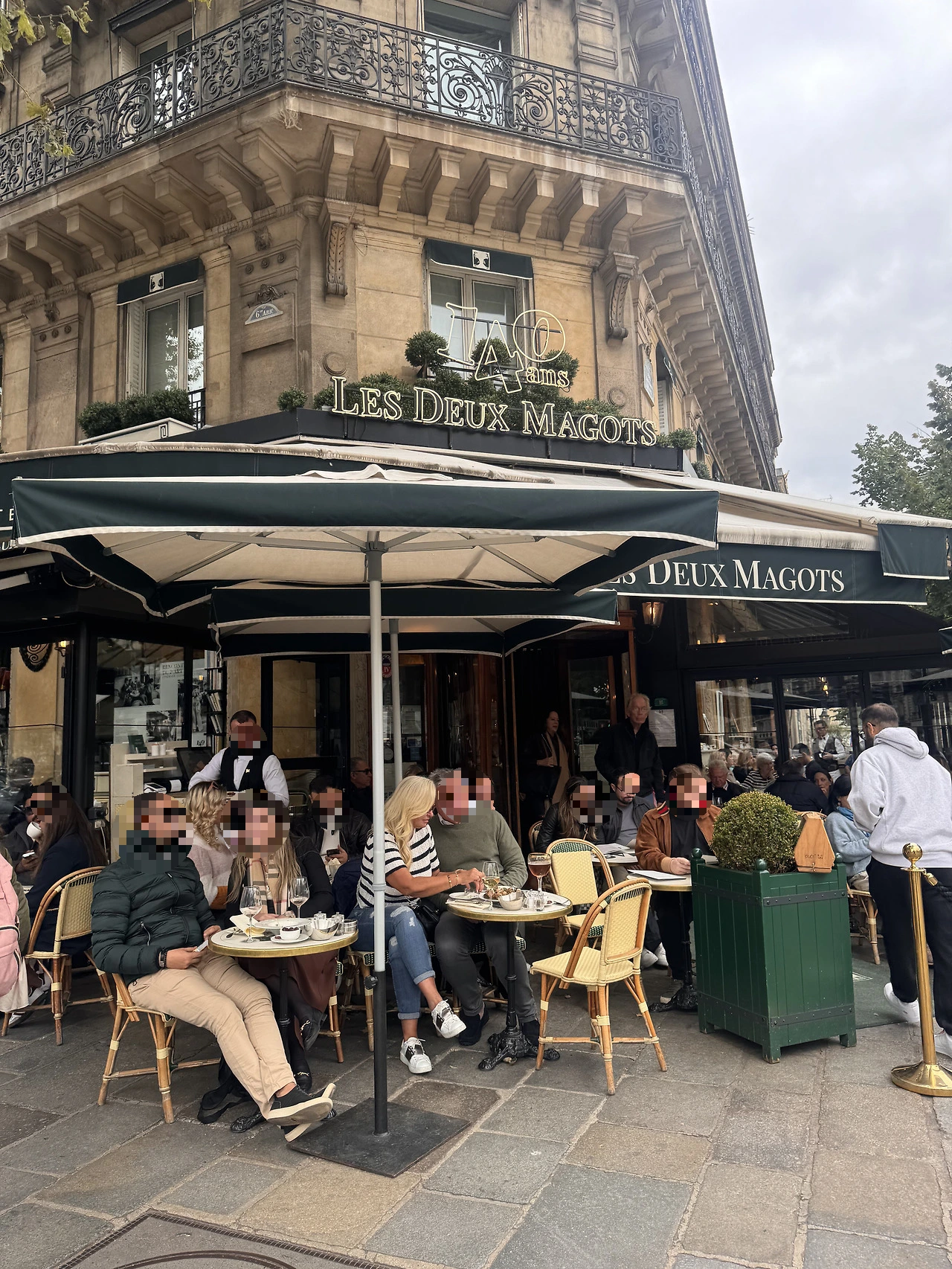 가장 먼저 향한 곳은 그가 글을 쓰곤 했던 ‘레 뒤 마고’와 ‘카페 드 플로르’였다. 그 카페들은 길 하나를 사이에 두고 나란히 위치해 있다. 찾으려 노력하지 않아도 그곳들이 어디인지 한눈에 알 수 있었다. 사람들로 북적였기 때문이다. 특히 카페 드 플로르는 들어갈 엄두를 내지 못할 정도로 많은 많은 사람들이 기다리고 있었다. 아마도 넷플릭스 드라마인 ‘에밀리, 파리에 가다’의 촬영지이기도 하기 때문일 것이다. 그에 반해 레 뒤 마고는 북적이긴 했지만 대기줄이 거의 없었다. 나는 사람이 적은 쪽에서 커피를 마시기로 했다.