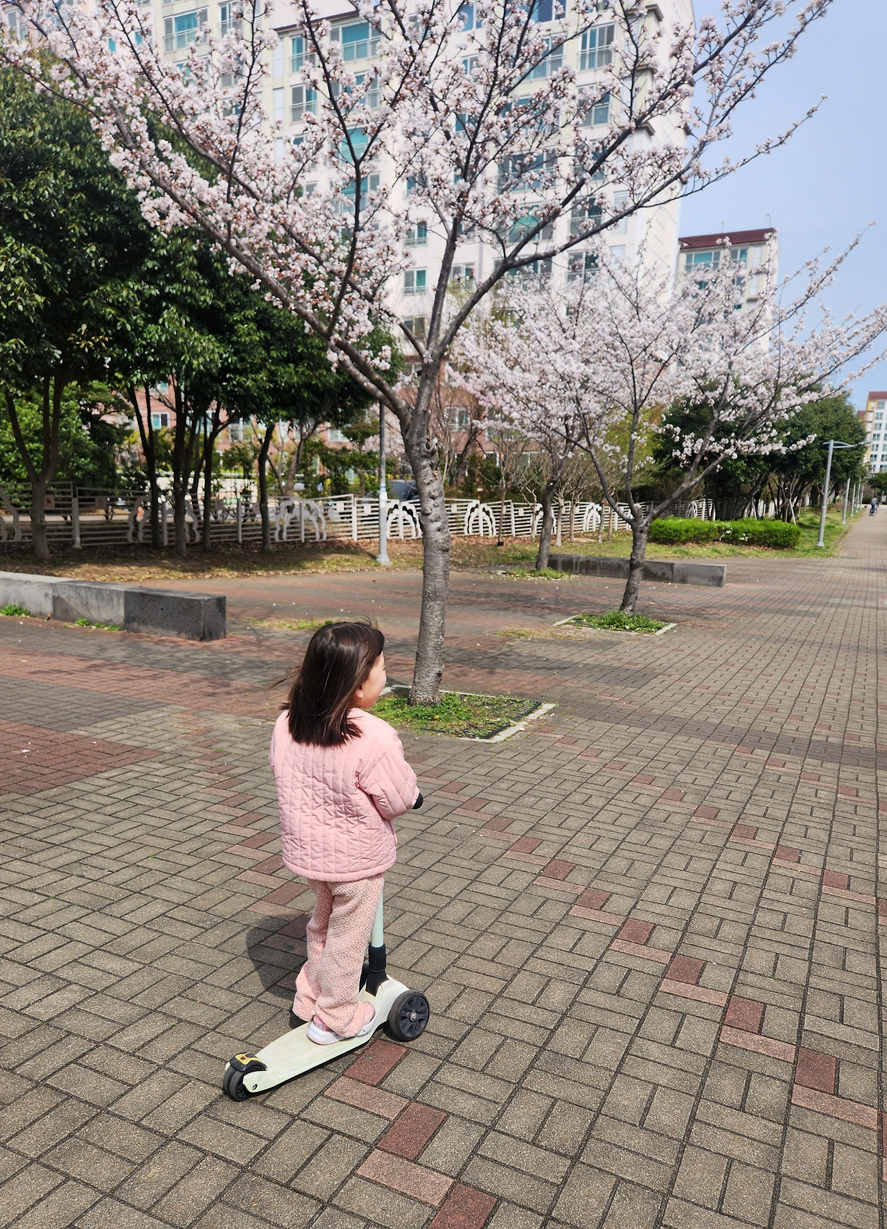 쌩쌩 킥보드를 타고 달리는 첫째 아이를 앞세워 꽃구경에 나섰다.