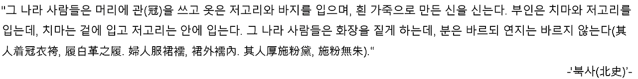 중국의 역사책 《북사(北史)》에는 백제 여인들의 화장에 대한 짧은 기록이 남아 있다.