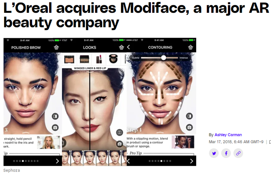 로레알은 2018년 AR 뷰티테크 전문 기업 Modiface를 인수하며 이 분야에 전략적으로 투자하였다. 이 서비스는 주로 색조 화장품과 헤어 컬러 제품이 본인과 어울리는지 확인하기 위한 것으로, 색조 브랜드에서 활발하게 진행되고 있다. 유튜브와 MAC Cosmetics의 협업, 아르마니 뷰티와 위챗의 협업 사례처럼 플랫폼과 브랜드 간 경계를 넘나드는 형태로도 빠르게 확장되고 있다.