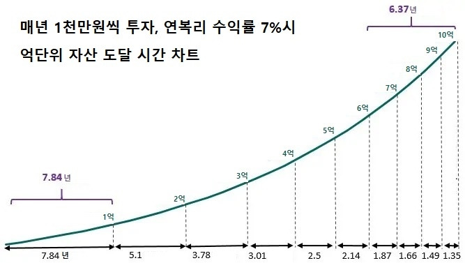 매년 1천만 원을 투자하고, 연복리 수익률 7%를 가정했을 때, 매 1억 도달에 걸리는 시간을 보여줍니다.