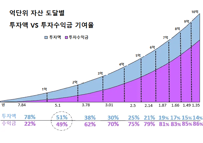 동일한 조건에서 매억 단위별로 ‘투자원금’과 ‘수익금’의 비중을 보여줍니다. 첫 1억까지는 거의 80%가 내가 투자한 돈입니다. 그러나 2억에 도달할 때부터는 수익금의 비중이 절반 가까이로 늘어나며, 3억 이상 구간부터 수익금이 투자액의 두 배 이상이 됩니다. 이 시점부터는 본격적으로 ‘돈이 돈을 버는’ 구조, 즉 자산이 나 대신 일하는 구조가 만들어지는 것입니다.