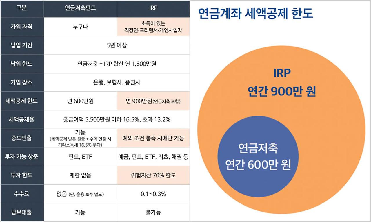 둘 다 세액공제 + 과세이연 + 저율과세의 3단 혜택을 주는 절세 유니버스의 중심축이죠.