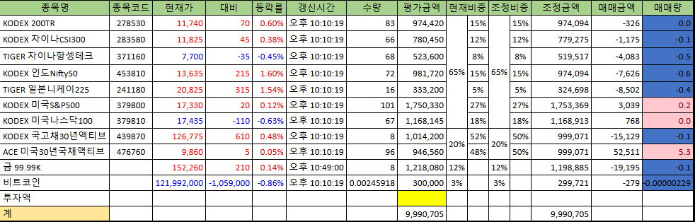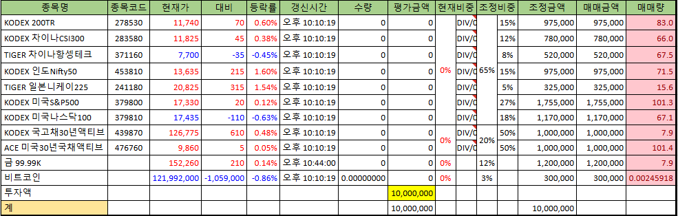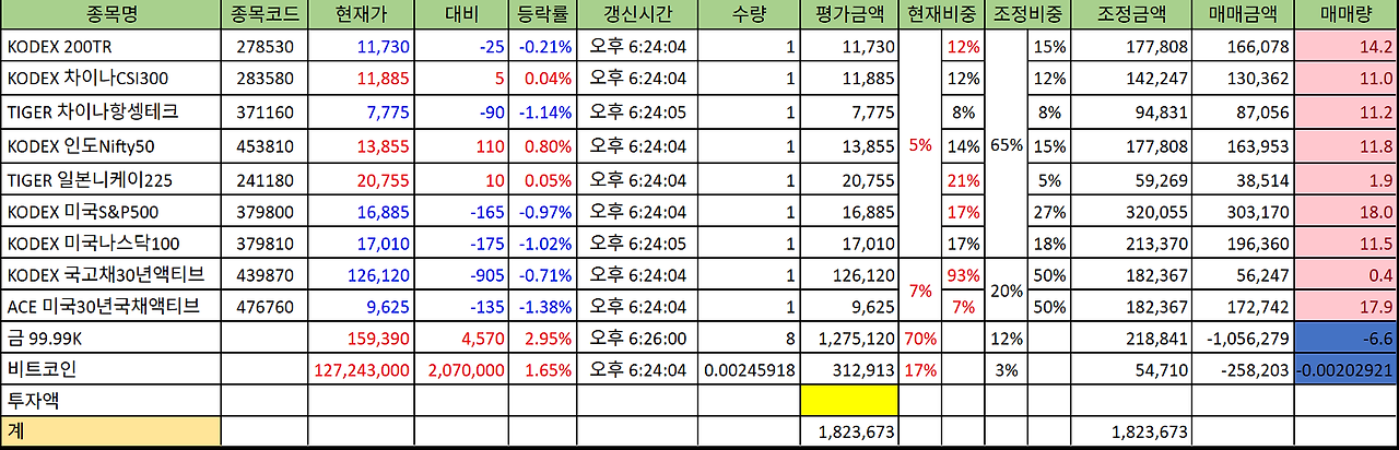 종목의 현재가가 매 순간 달라지므로, 매매량도 자동으로 조정됩니다. 매수는 빨간색, 매도는 파란색으로 표시됩니다. 완벽하게 맞출 필요는 없습니다. 이제 스프레드시트는 닫고, 다음 달 월급일에 똑같이 이 작업을 계속 반복하시면 됩니다. 정말 10분이면 끝납니다.