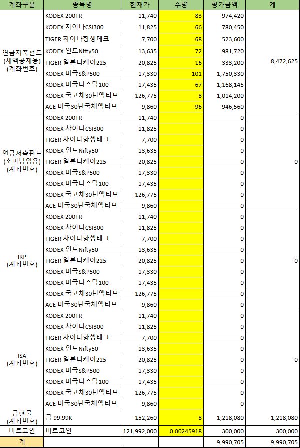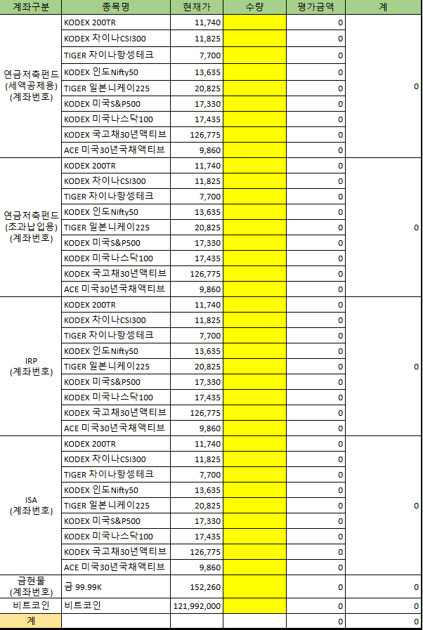 계좌별 시트에는 각 투자 계좌가 나열되어 있으며, 총괄표와 연동되어 있습니다.