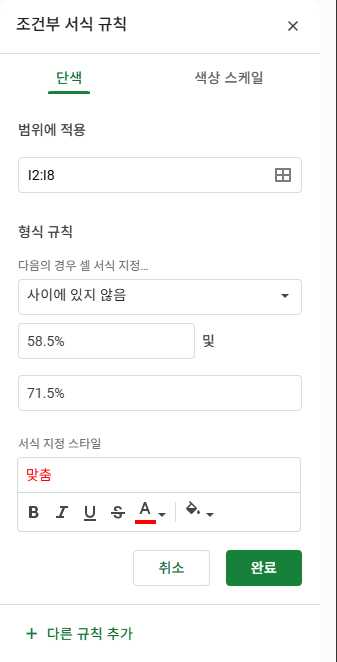 리밸런싱 기준을 바꾸고 싶다면 PC에서 접속 후 메뉴에서 [서식] -> [조건부서식]에서 자유롭게 수정 가능합니다.