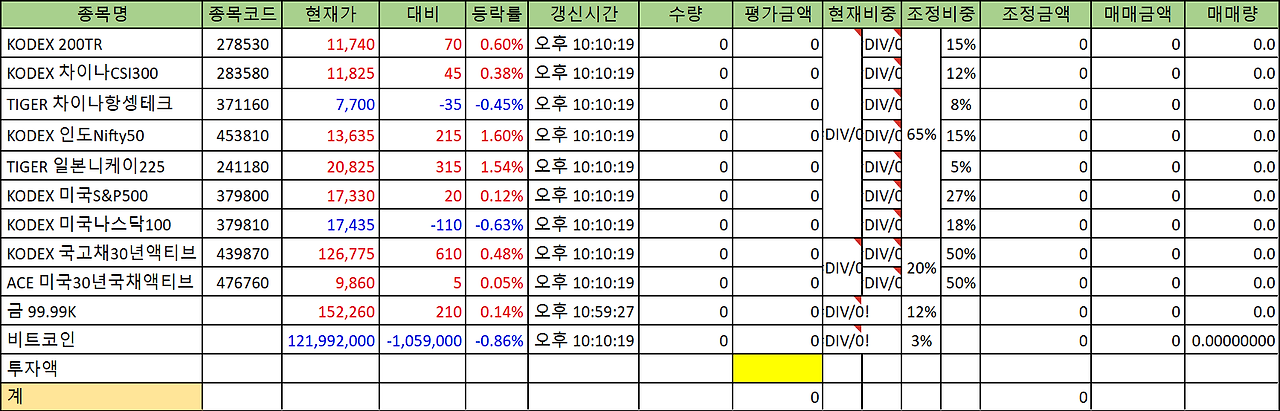 조정비중은 목표 포트폴리오입니다. 기본값은 제가 쓰는 포트폴리오지만, 원하시는 대로 자유롭게 수정하셔도 됩니다.