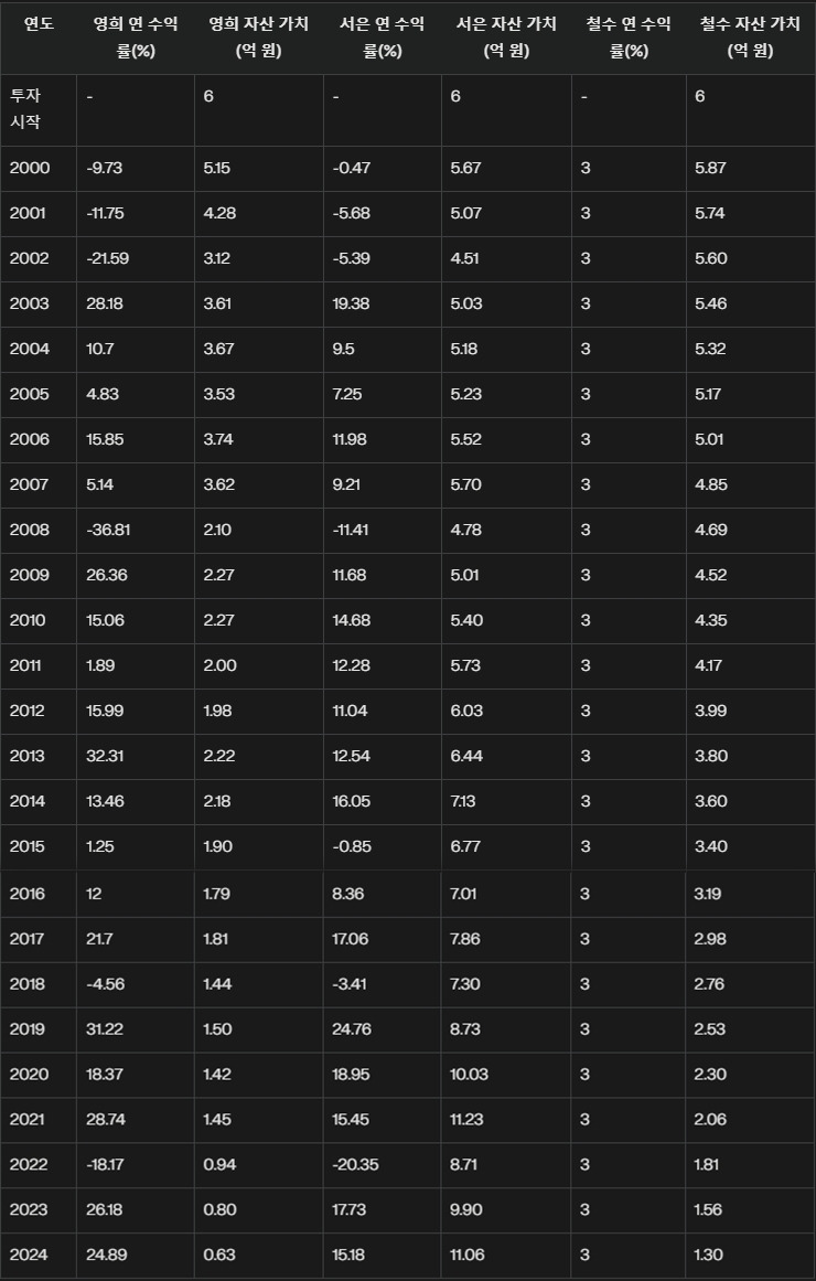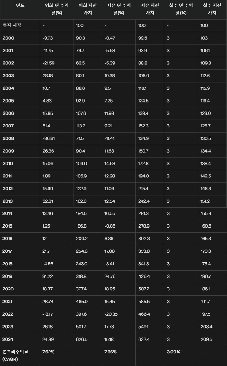 영희는 2000년 초에 주식 100%에, 서은은 주식 60% 채권 30% 금 10%의 자산배분 전략으로, 철수는 예금에 3% 금리로 투자하였습니다.