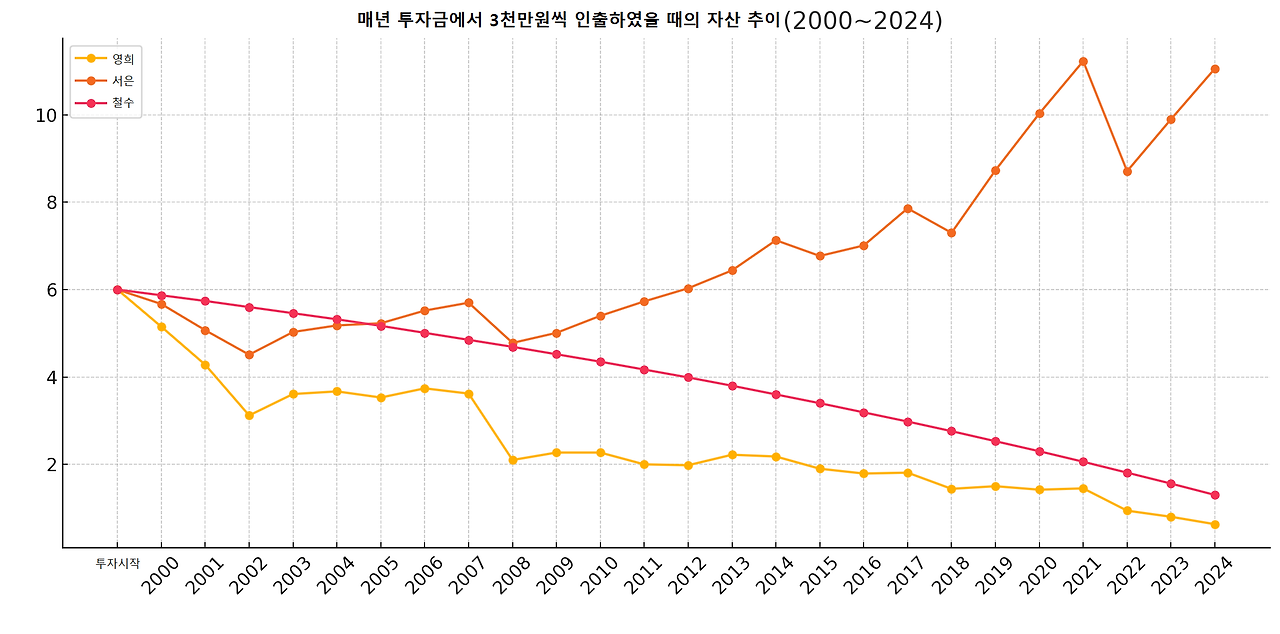 반면, 서은은 매년 3천만 원씩 인출하면서도 위험을 잘 관리해 자산을 안정적으로 성장시켰고, 은퇴 한 지 25년이 지난 후에도 11억 원이라는 큰 자산을 보유할 수 있었습니다.