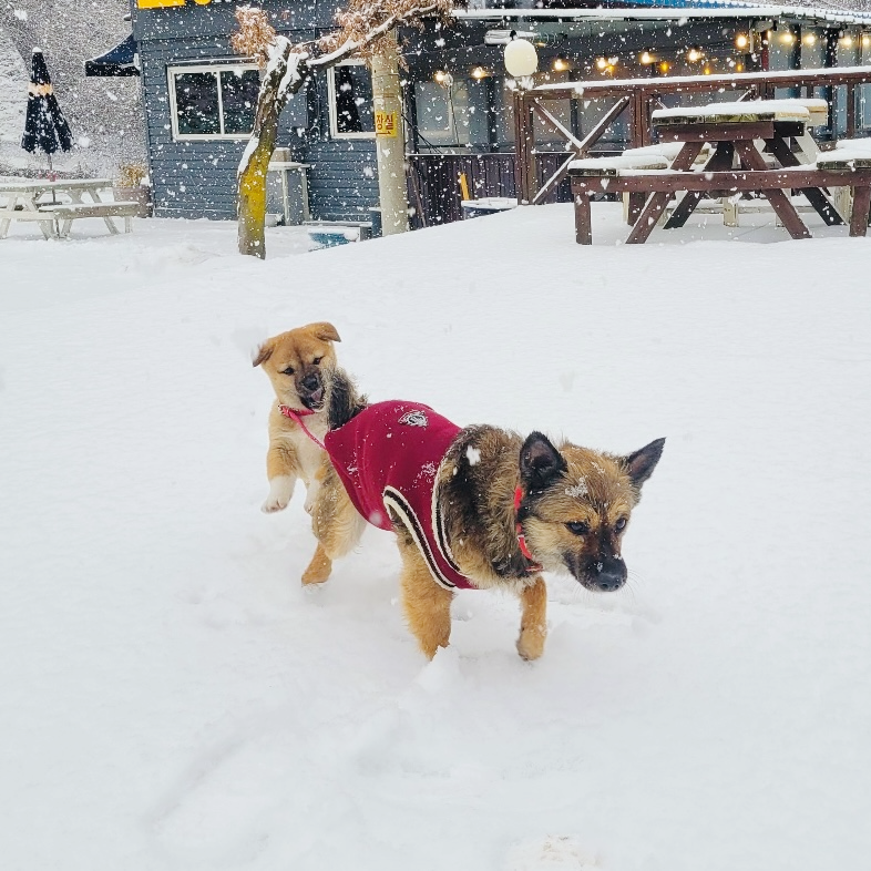 그리고 그 옆엔, 손님 눈치를 보며 뭐라도 떨어지길 기다리는 강아지 두 마리가 있다.